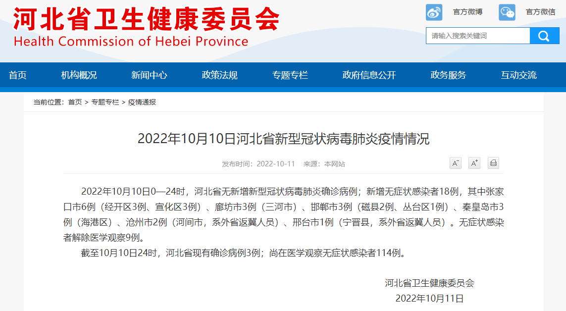 2022年10月10日0—24时,河北省无新增新型冠状病毒肺炎确诊病例;新增无症状感染者18例,其中张家口市6例(经开区3例、宣化区3例)、廊坊市3例(三河市)、邯郸市3例(磁县2例、丛台区1例)、秦皇岛市3例(海港区)、沧州市2例(河间市,系外省返冀人员)、邢台市1例(宁晋县,系外省返冀人员)。无症状感染者解除医学观察9例。