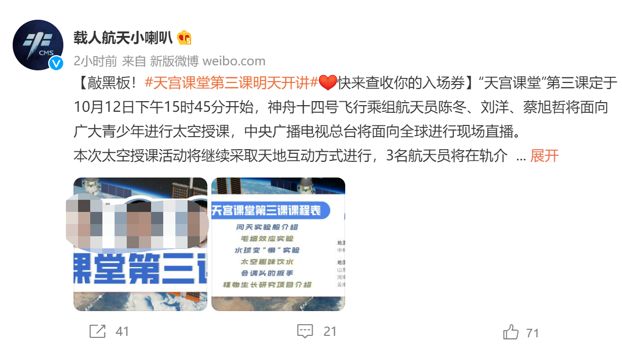 “天宫课堂”第三课定于10月12日下午15时45分开始,神舟十四号飞行乘组航天员陈冬、刘洋、蔡旭哲将面向广大青少年进行太空授课,中央广播电视总台将面向全球进行现场直播。