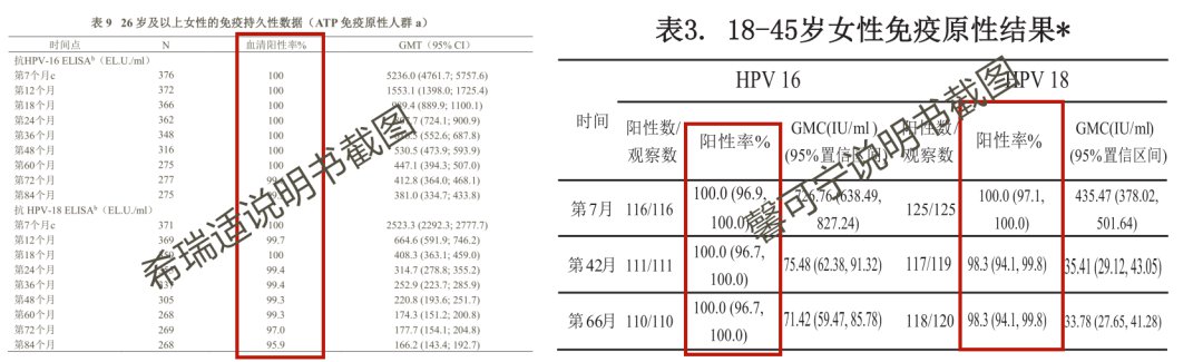 在HPV18的抗体持久度上,国产馨可宁在第42个月后为98.3%,进口希瑞适在接种48月后为99.3%;