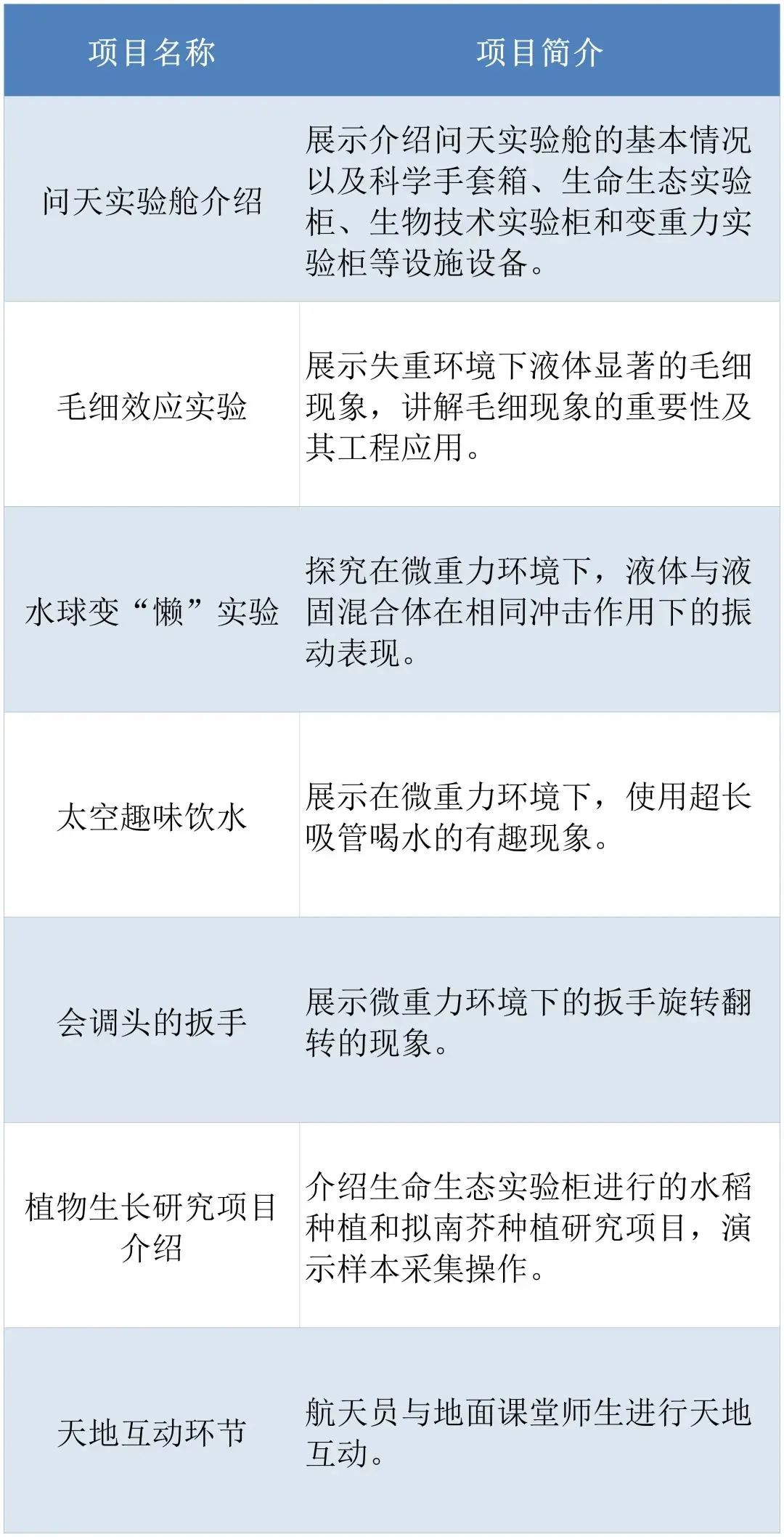 本次太空授课活动将继续采取天地互动方式进行,3名航天员将在轨介绍展示中国空间站问天实验舱工作生活场景,演示微重力环境下毛细效应实验、水球变“懒”实验、太空趣味饮水、会调头的扳手以及植物生长研究项目介绍,并与地面课堂进行互动交流。