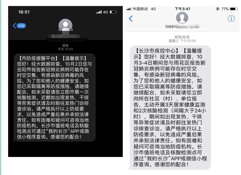 该短信为大数据大规模推送,数据来源是国家工信部根据中高风险区的划定,运算出来的手机信号漫游数据,此短信并非指市民是密接。如您来自中高风险地区所在地市,请您按提示做好个人防护,按要求进行核酸检测,避免影响日常生活;如您自我排查在中高风险地区驻留或者与感染者存在交集,请及时向所在社区报备并配合社区防疫要求;若您近期无风险轨迹及风险行为,则不必过多担心,按要求做好核酸检测及个人防护即可。