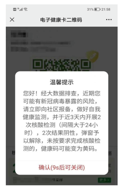 为了尽早发现疫情,对部分可能有感染风险但风险较低的持绿码人员,会采取健康码弹窗提醒方式。收到弹窗后,提示按规定进行核酸检测和自我健康监测。完成规定次数核酸检测后,弹窗可自动解除。