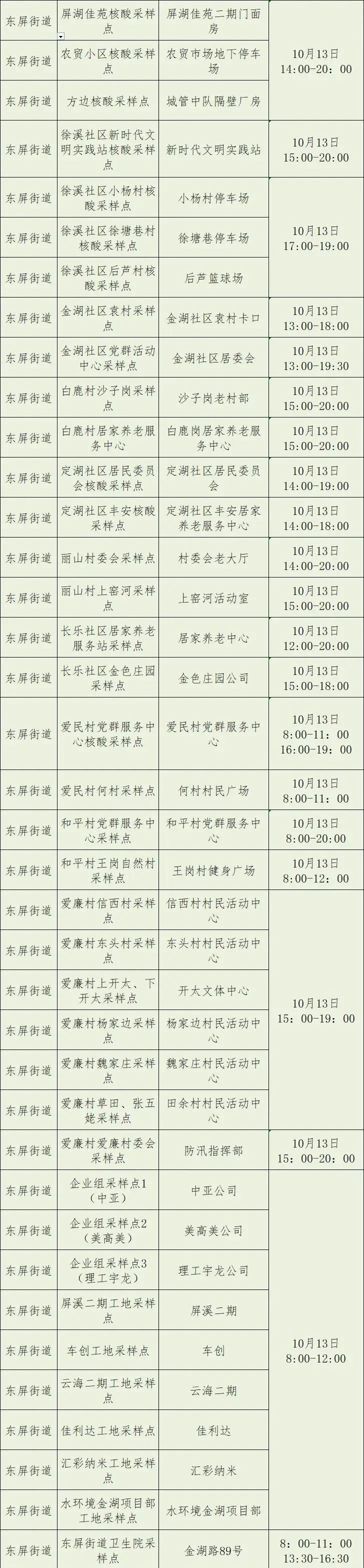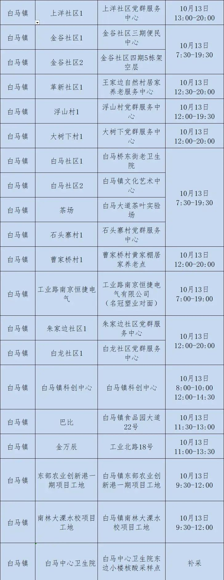 10月13日:开发区、洪蓝街道、东屏街道、白马镇、晶桥镇;