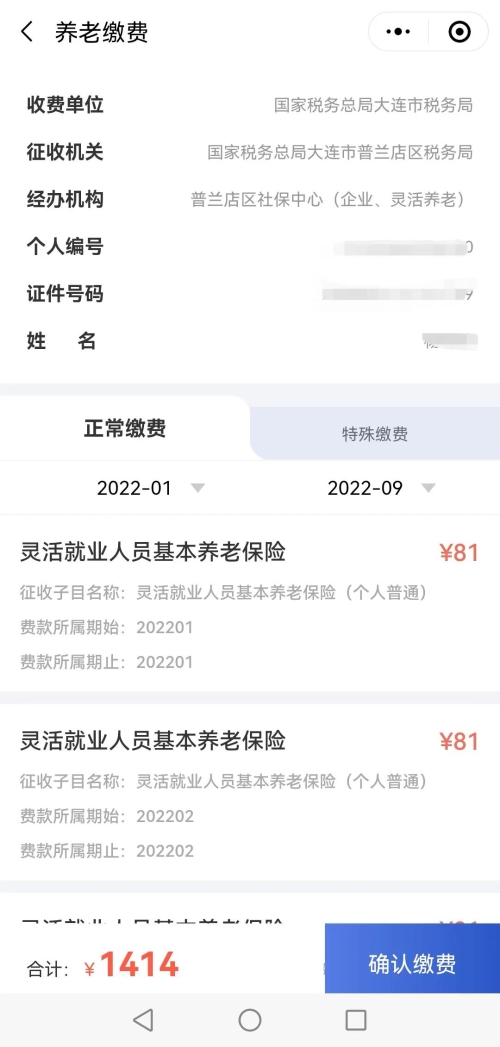 (四)点击“灵活就业养老保险”,点击“养老缴费”,选择想要缴费的常用缴费人人员信息,进入缴费页面,核对费款无误,点击“确认缴费”后即可进行缴费。