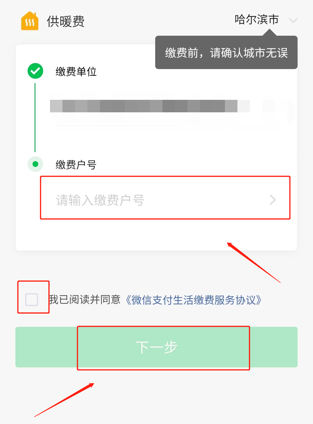 第四步:输入户号后点击下一步,最后进行缴费即可