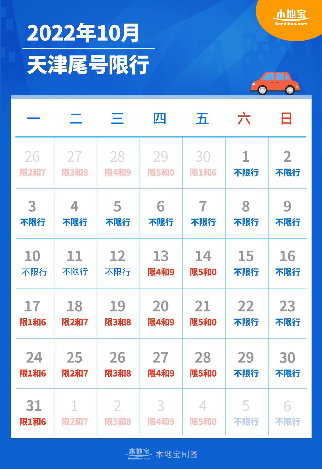 依据《天津市公安局关于继续实施机动车限行交通管理措施的通告》,自2022年10月13日至2023年1月1日,星期一至星期五限行机动车号牌尾号分别为1和6、2和7、3和8、4和9、5和0(机动车号牌尾号为英文字母的按0号管理)。