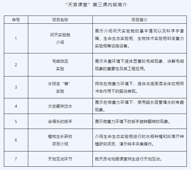 主要内容:本次太空授课活动将继续采取天地互动方式进行,3名航天员将在轨介绍展示中国空间站问天实验舱工作生活场景,演示微重力环境下毛细效应实验、水球变“懒”实验、太空趣味饮水、会调头的扳手以及植物生长研究项目介绍,并与地面课堂进行互动交流,旨在传播普及载人航天知识,激发广大青少年对科学的兴趣。