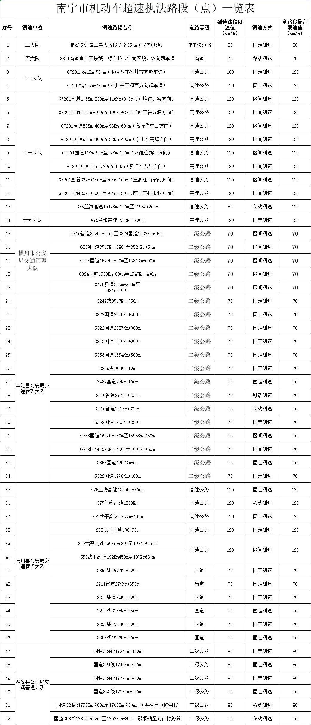 南宁市机动车超速执法路段(点)一览表