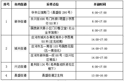 采样点位以北黄海经开区、街道乡镇、社区(村)、单位通知为准。市内四街道设置全程固定开放常态化核酸采样点(详见附表1)。