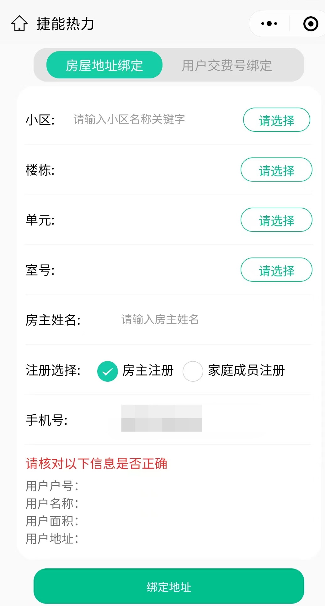 5、如果您有多套房产请在我的房产下继续进行绑定,如有问题请点击问题反馈菜单进行反馈,也可在捷能热力公众号下进行咨询