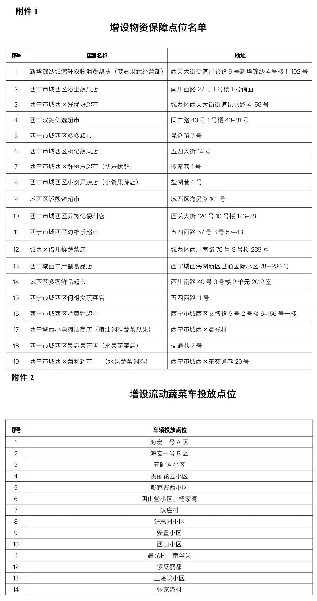 为全力做好群众基本生活物资供应,保障广大群众居家工作生活期间就近、就便购买基本生活物资,经区指挥部研究决定,辖区增设便利店(菜铺)19家(见附件1),增加流动蔬菜车投放点位14个(见附件2),前期公布的物资保障点持续供应。