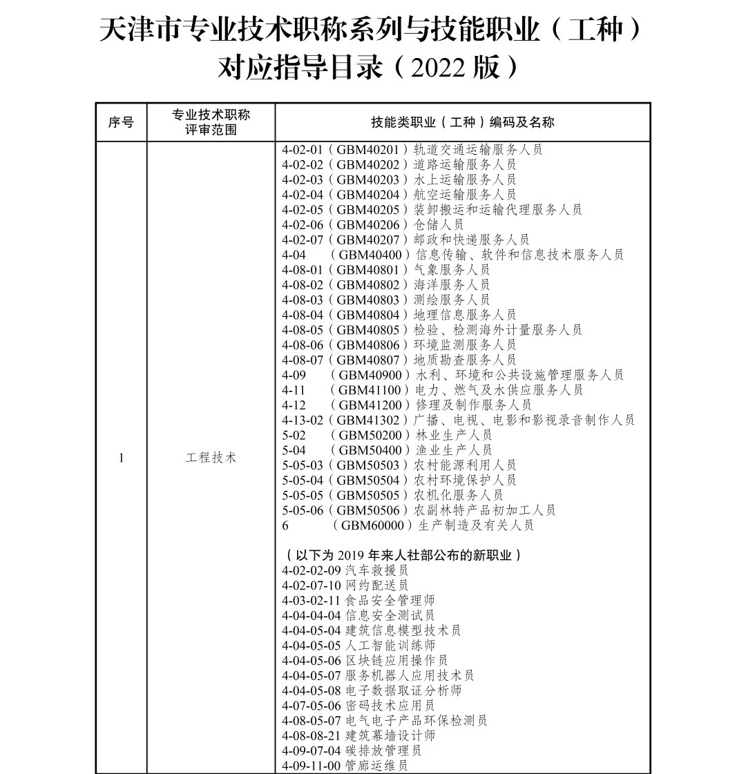 天津市专业技术职称系列与技能职业(工种)对应指导目录(2022版)