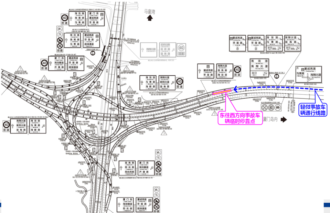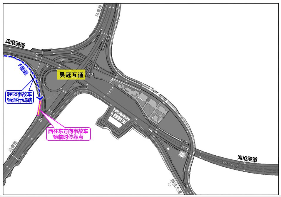 轻微事故应将车辆开往事故车辆临时停靠点等候处置,主线东往西方向事故车辆临时停靠点位于短隧道出口前方约350米分流三角区,主线西往东方向事故车辆临时停靠点位于疏港通道长隧道出口右转匝道终点。