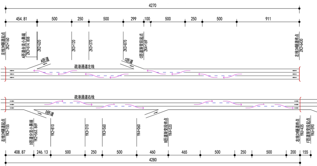 2#隧道为特长隧道,隧道车道分界线采用白色实线与白色虚线相结合,虚线段允许车辆变道。