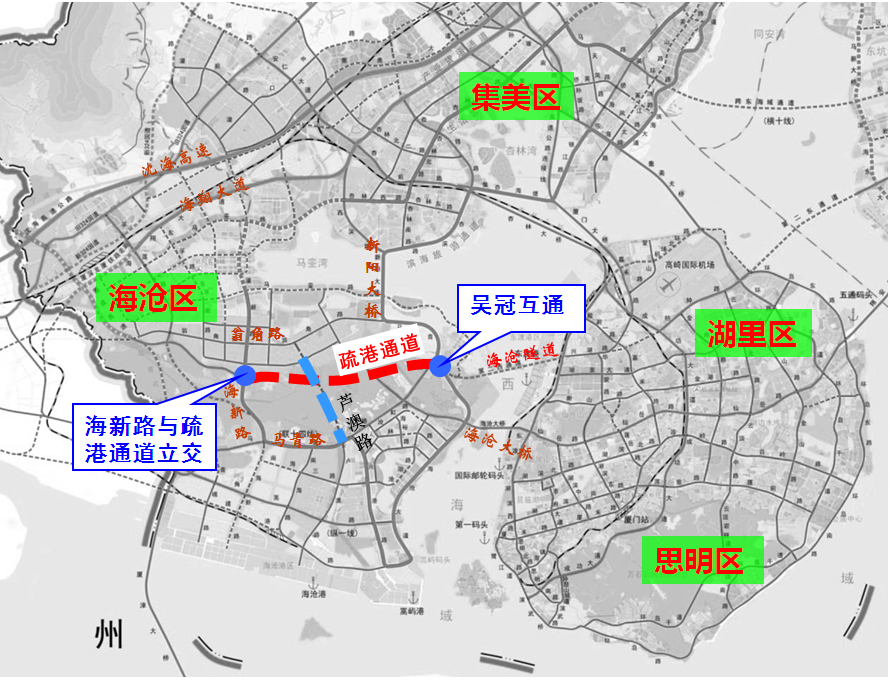 疏港通道位于海沧区,主线呈东西走向,西起海新路与疏港通道立交,东接马青路与海沧隧道接线立交(吴冠互通),全长约5.3公里。