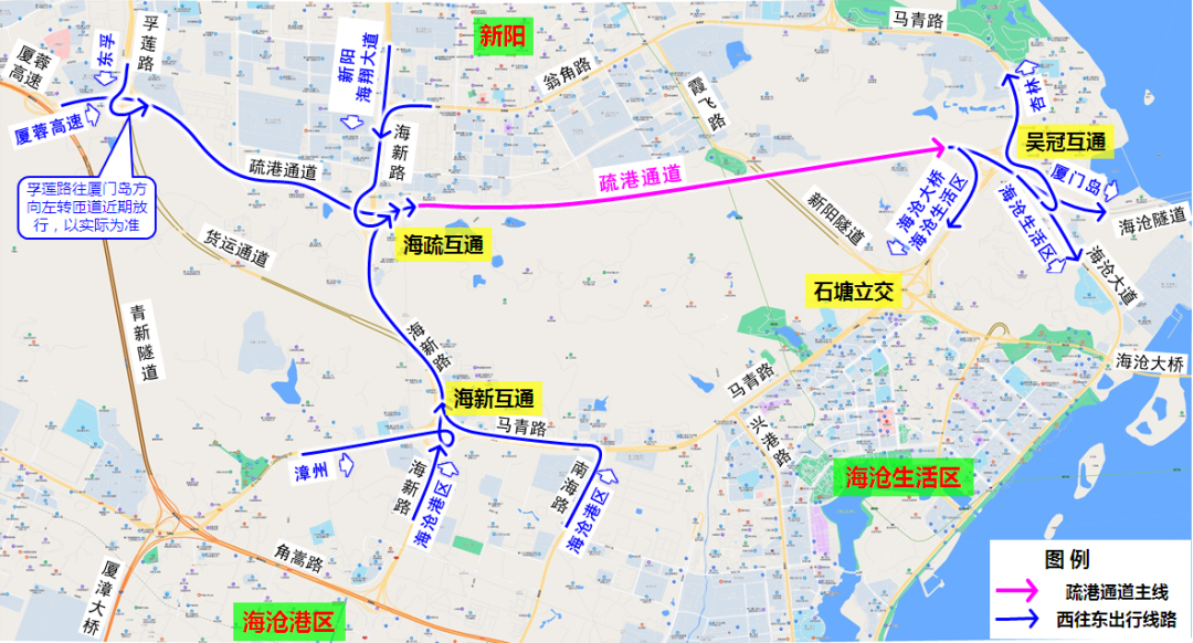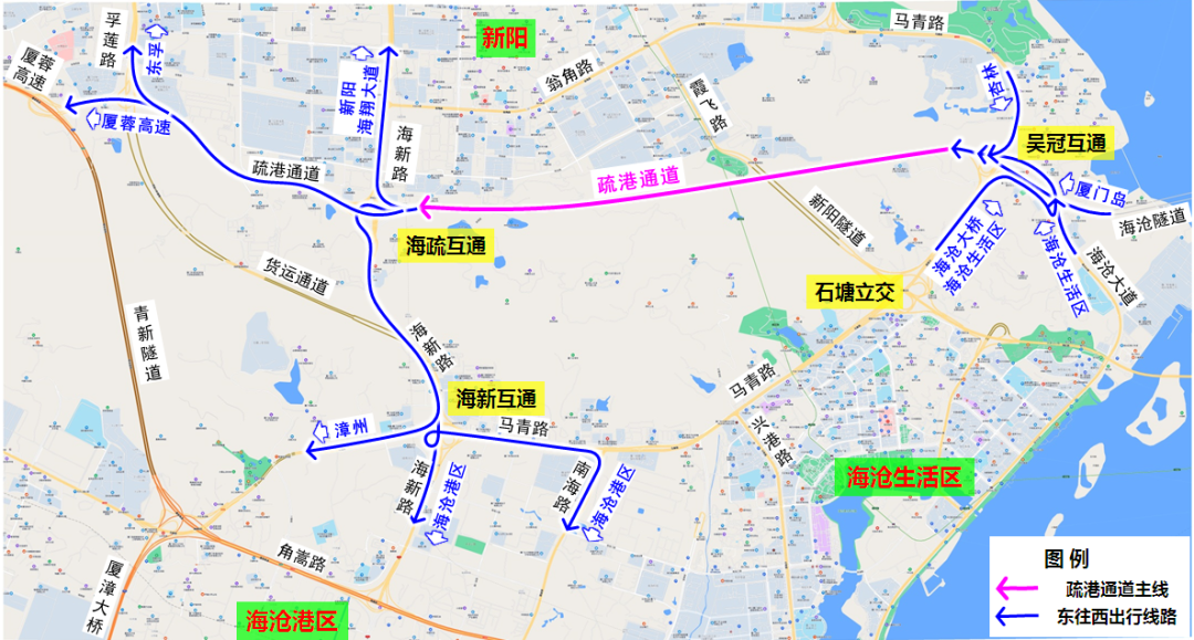 海沧隧道厦门岛来向车辆、马青路杏林来向车辆、马青路海沧大桥来向车辆、海沧大道海沧生活区来向车辆可通过疏港通道快速到达厦蓉高速、海新路、海沧港区、海翔大道、新阳、东孚。