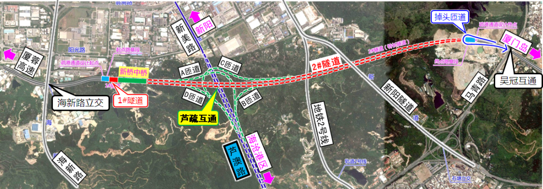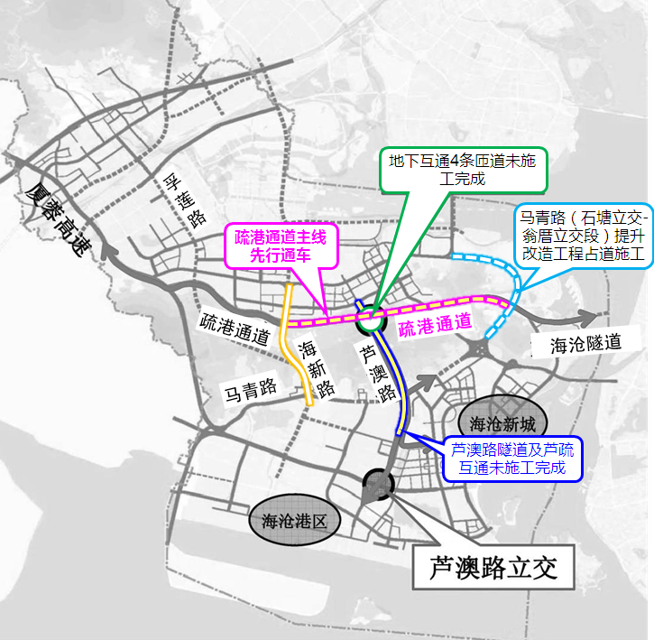 海沧疏港通道工程地下互通:地下互通4条匝道及芦澳路隧道主线未施工完成。