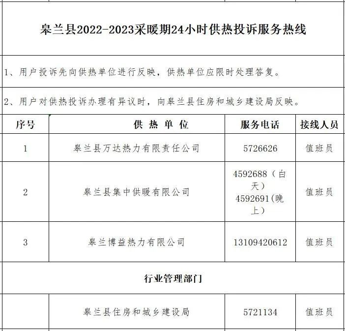 皋兰县2022-2023采暖期24小时供热投诉服务热线