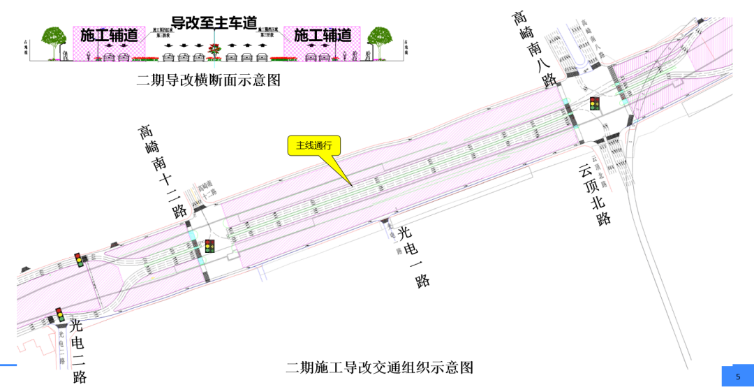 枋钟路/高崎南十二路口、云顶北路口节点恢复原信号灯控制,利用永久道路的主线双向6车道通行,两侧围挡施工辅道。