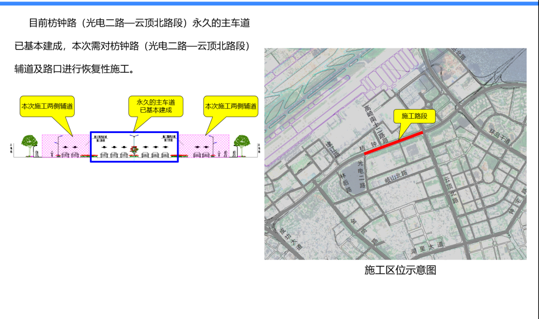因枋钟路(光电二路—云顶北路段)辅道及路口恢复性施工,为确保施工期间道路安全、畅通,需取消枋钟路(光电二路—云顶北路段)的3处临时掉头区,恢复枋钟路/高崎南十二路口和枋钟路/云顶北路2个平面交叉路口,并采用信号灯控制。