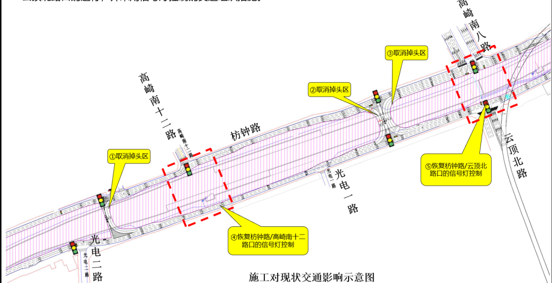 本次施工期间需取消枋钟路(光电二路—云顶北路段)的3处临时掉头区,恢复枋钟路/高崎南十二路口、云顶北路口的通行,并采用信号灯控制的交通组织措施。