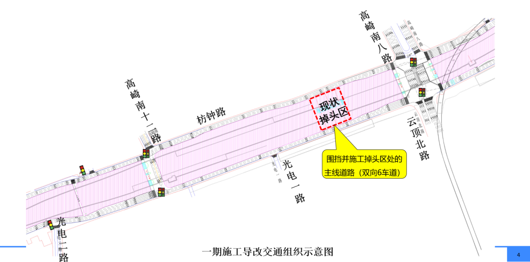 临时导改道路维持在现状辅道,封闭枋钟路(光电二路—云顶北路段)的3处掉头区,恢复枋钟路/高崎南十二路口、云顶北路口的信号灯控制,施工原临时掉头区处的主线道路。