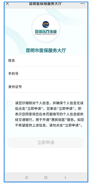 2021年9月,昆明市医疗保障局与交通银行云南省分行签订《昆明市“信用就医”合作协议》,由交通银行协助昆明市医疗保障局打造“信用就医”综合平台。开通“信用就医”无需额外申请银行卡,申请额度根据申请人的情况不同而不同。
