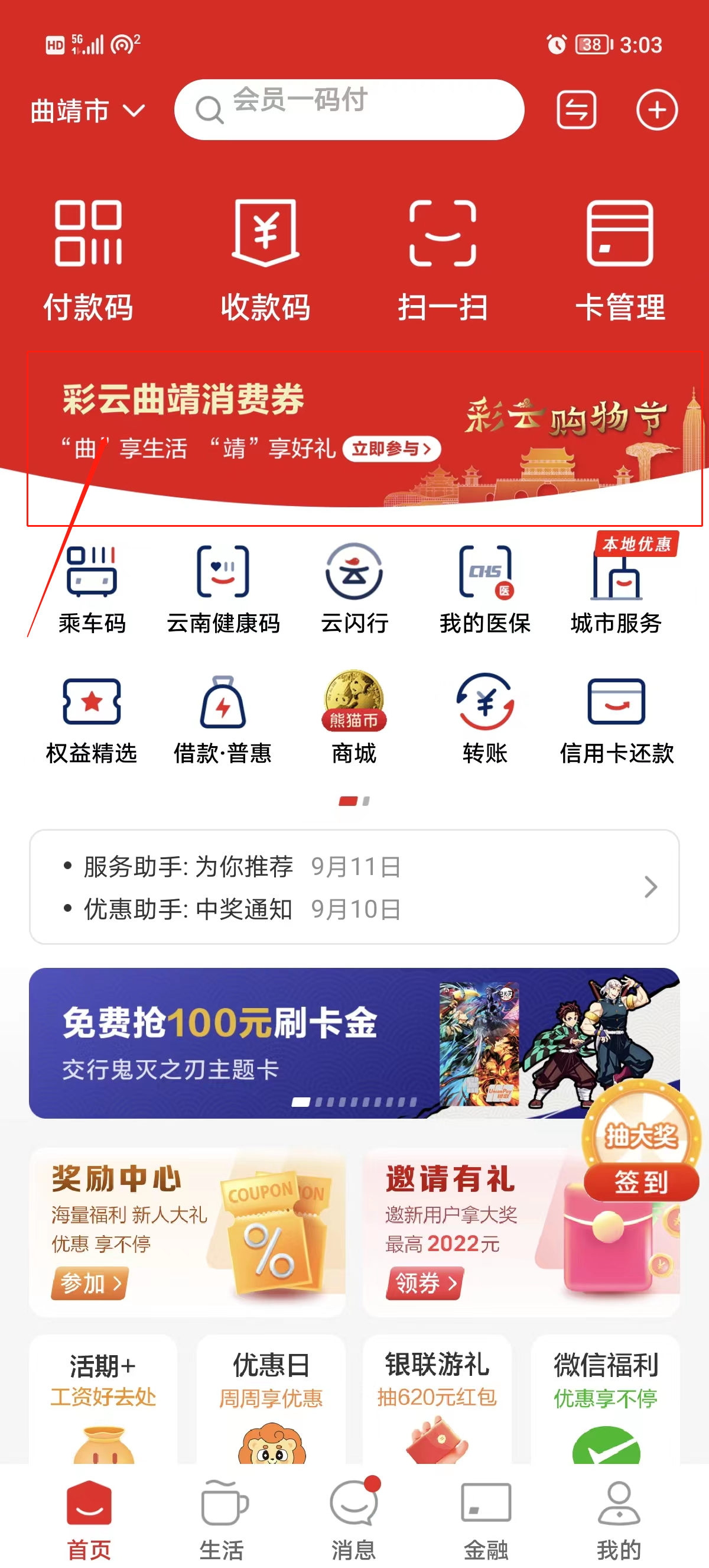 打开云闪付APP首页,找到找到彩云曲靖消费券活动页面。(如该页面消失,请用方式二)