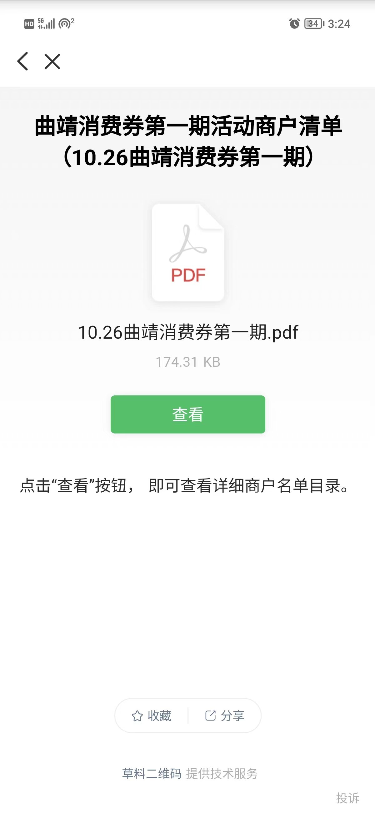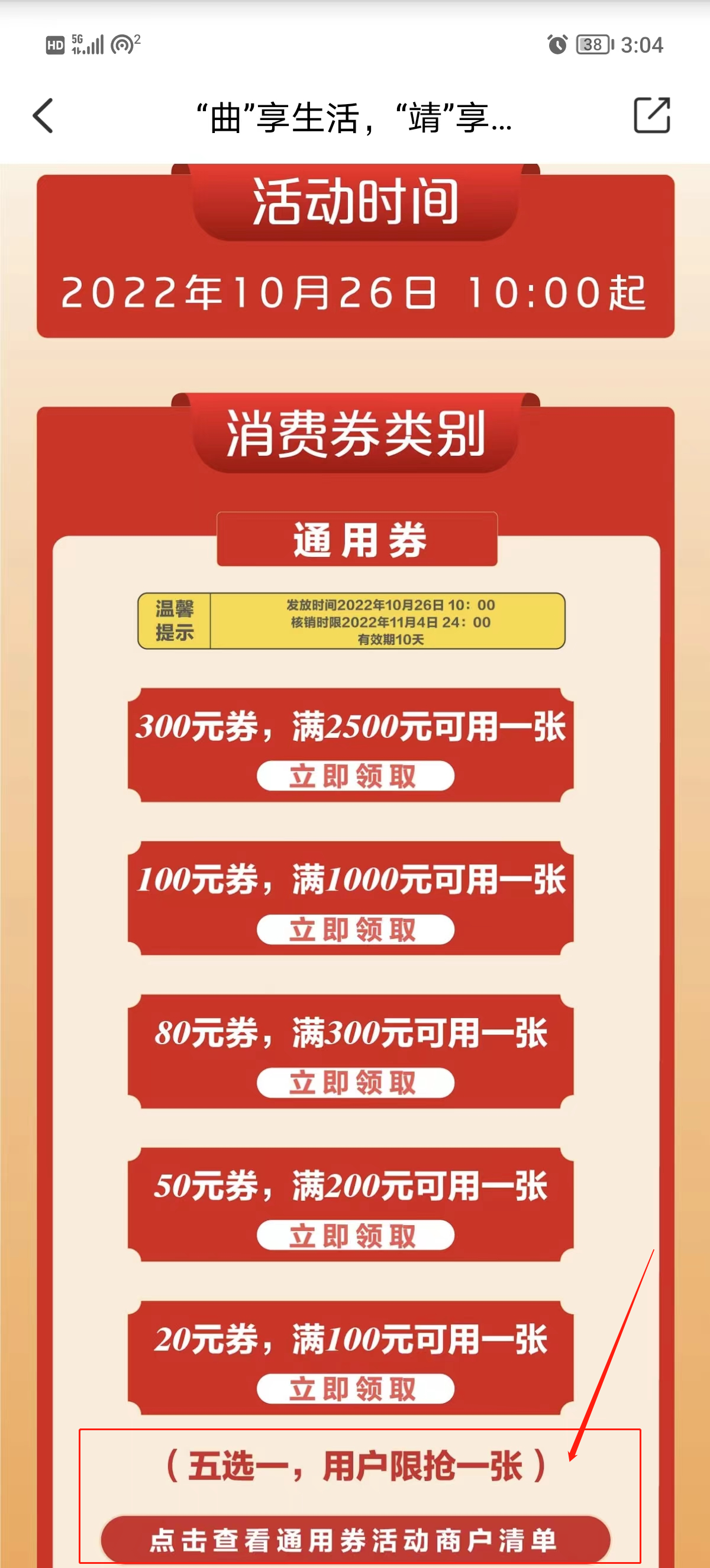 3.进入”彩云曲靖消费券“页面后,在最下方找到通用券活动商户清单。