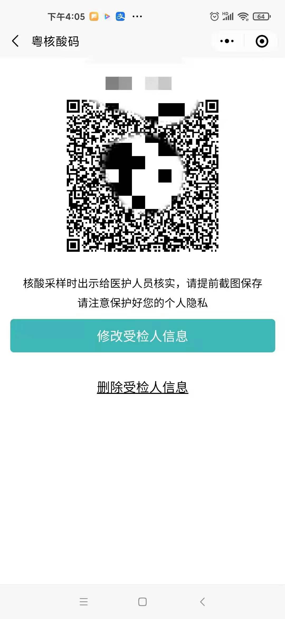 请辖区内的常住居民提前扫下方“粤核酸”二维码逐个登记家庭成员信息,并保存好登记成功的二维码截图。检测前,凭二维码截图和粤康码进场,粤康码红码、黄码不得进入。