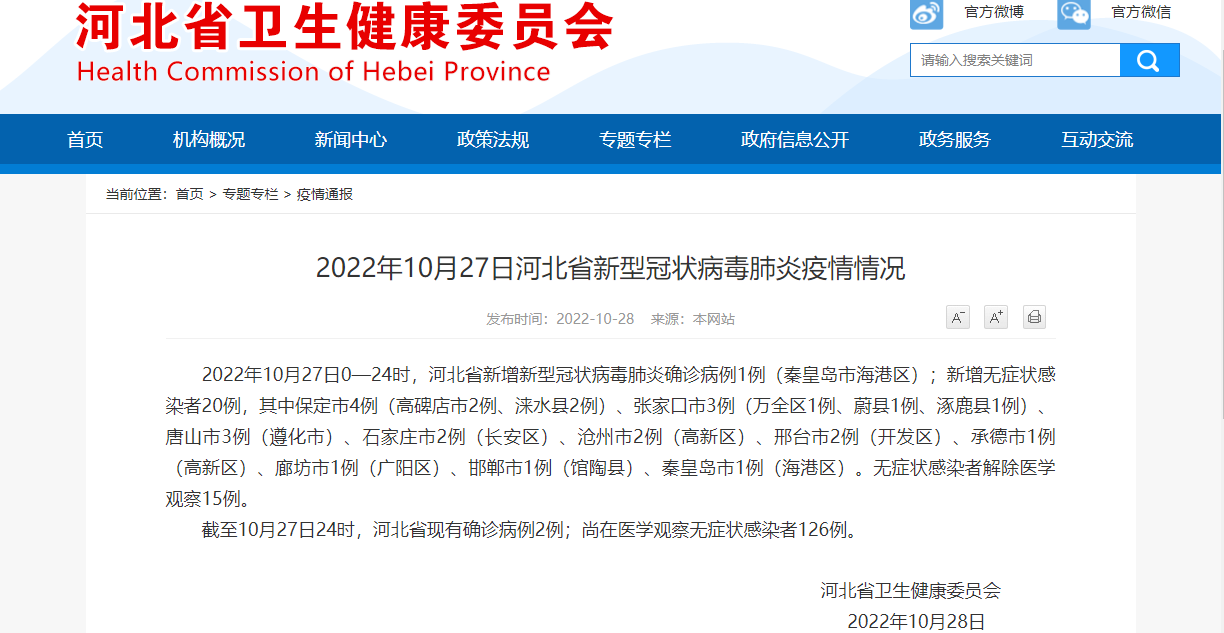 截至10月27日24时,河北省现有确诊病例2例;尚在医学观察无症状感染者126例。