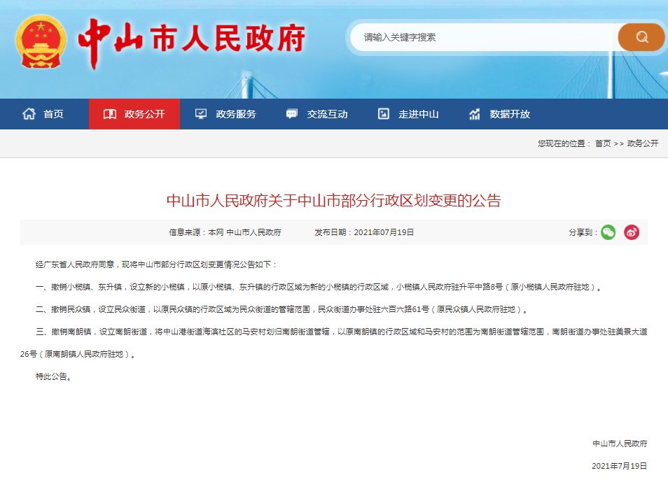 中山市人民政府关于中山市部分行政区划变更的公告原文