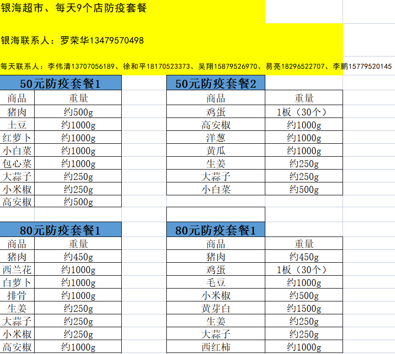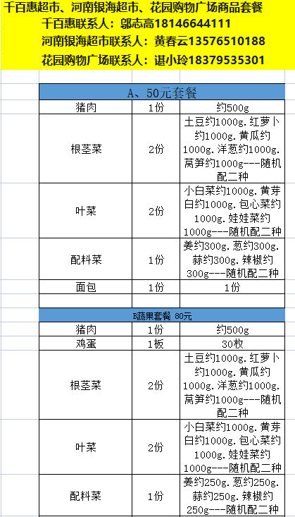 我县城区大型超市作为生活必需品重点保供点,通过套餐包的形式,为广大市民提供生活物资。城区重点保供超市信息如下:银海购物广场、华润万家、紫金购物广场、欣荣购物广场、每天超市、千百惠超市、河南银海生活超市、花园购物广场、宝龙食品。