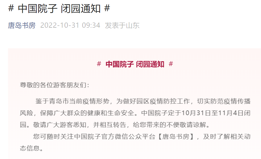 鉴于青岛市当前疫情形势,为做好园区疫情防控工作,切实防范疫情传播风险,保障广大群众的健康和生命安全。中国院子定于10月31日至11月4日闭园。敬请广大游客悉知,并相互转告,给您带来的不便敬请谅解。