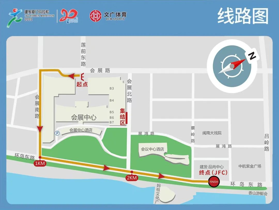 2022建发厦门马拉松亲子跑作为厦门马拉松二十周年的配套活动,相较2021年线路优化升级,将终点设在场地更为宽阔的JFC广场,途径风光优美的环岛东路段。