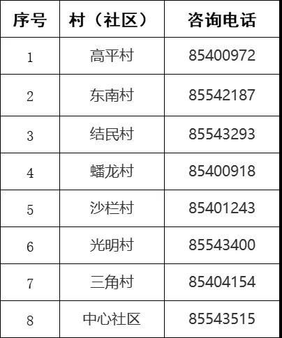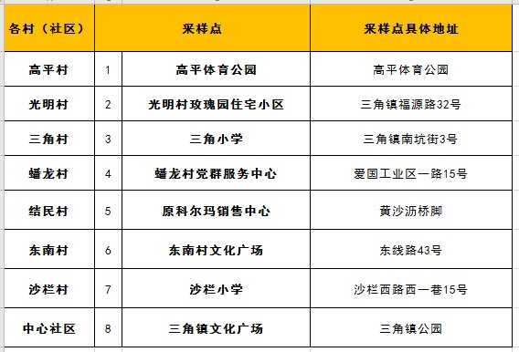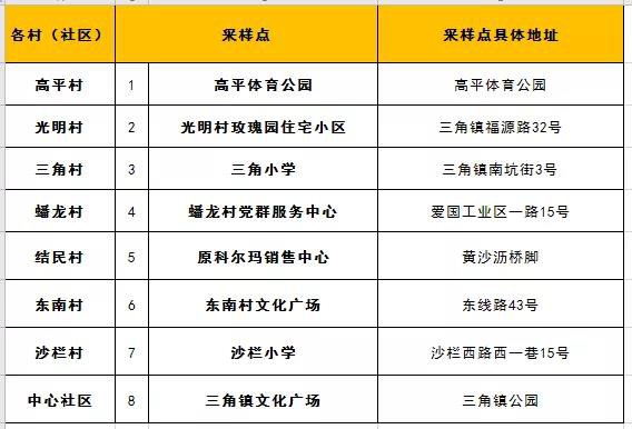 请全镇常住居民按照村(社区)指引,根据“就近原则”,有序到以下指定地点开展核酸检测(粤康码红码黄码人员切勿到采样现场,请联系镇疾控中心,联系电话:85544051):
