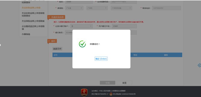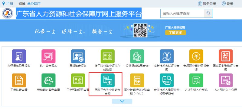 1、广东省人力资源和社会保障厅网上服务平台-> 国家平台失业补助金申领 -> 失业补助金申领。
