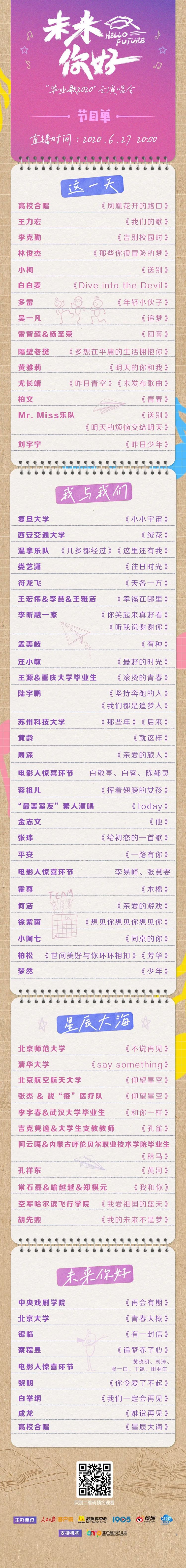 2020年6月27日8点,未来你好“毕业歌2020”云演唱会,77所高校首次云相见,百位明星踏歌祝福这份节目单请收好!
