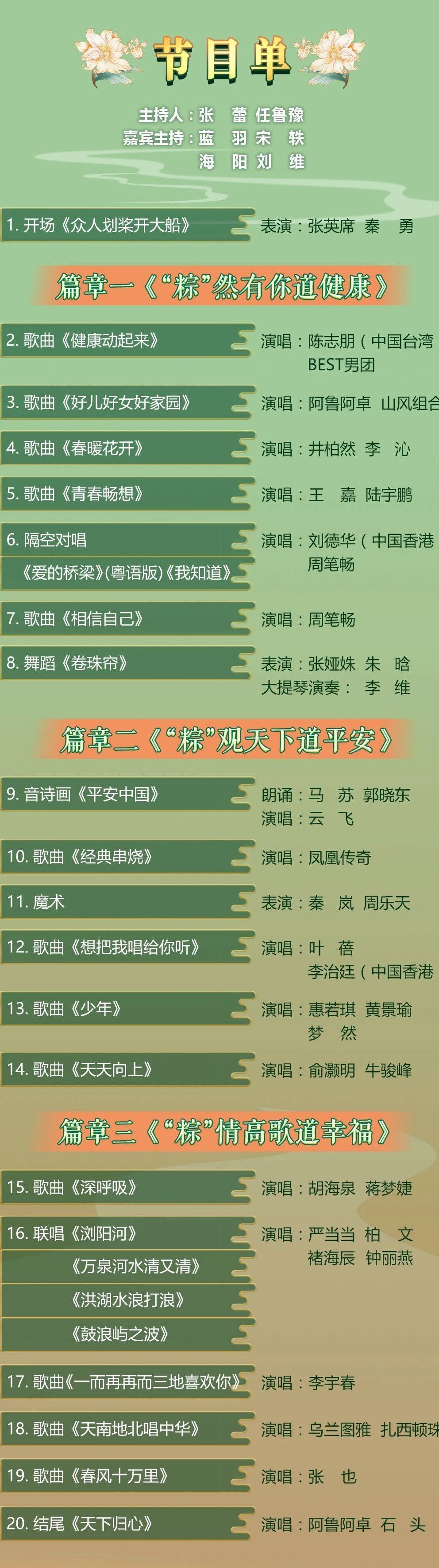 ①著名歌唱家张英席搭档秦勇合唱《众人划桨开大船》震撼开场,刘德华、周笔畅隔空对唱《爱的桥梁》,胡海泉、蒋梦婕“老歌新唱”《深呼吸》,惠若琪跨界助攻黄景瑜、梦然带来歌曲《少年》,李宇春则是用一首《一而再再而三地喜欢你》表达对端午安康的佳节祝福,还有秦岚、李沁、井柏然、马苏、郭晓东、李治廷、俞灏明、牛骏峰、蒋梦婕、陈志朋等众多影视演员、歌手也将亮相舞台,为观众带来一场融家国情怀、传统文化、地方元素于一体的视听盛宴。