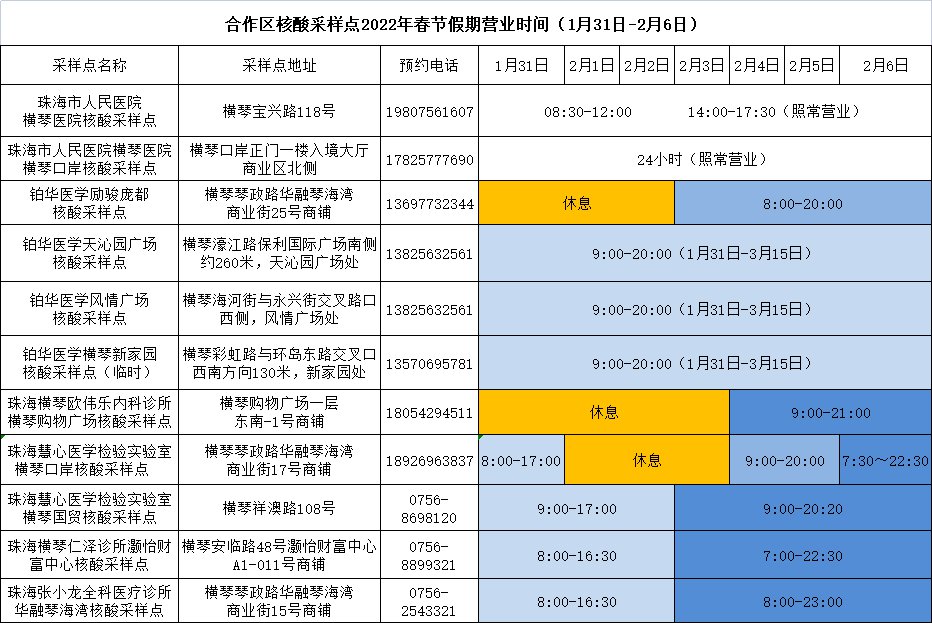 2022珠海横琴新区核酸检测采样点春节营业时间
