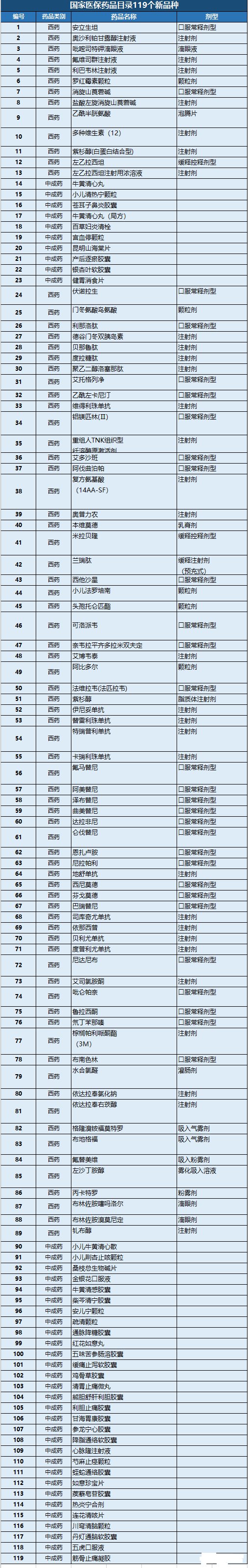 国家医保局介绍,调整后的《2020年药品目录》内药品总数为2800种,其中西药1426种,中成药1374种。与往年相比,2020年医保目录调入药品数量最多,惠及领域最为广泛,新调入的119种药品涉及31个临床组别。