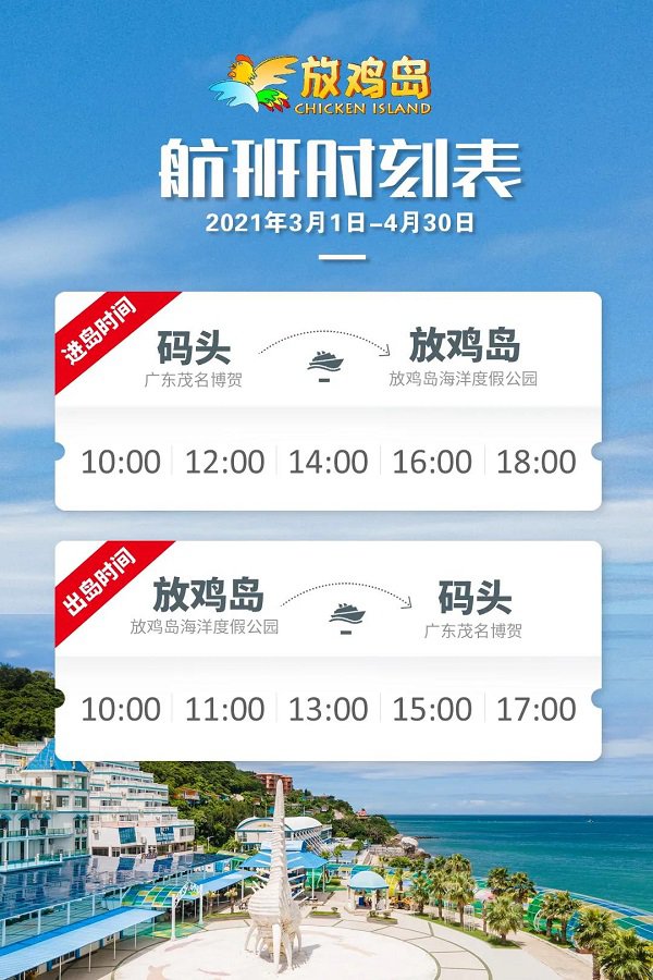 搭乘火车或动车到达茂名站,出站乘坐的士或私家车直达放鸡岛码头侯船上岛。(茂名——放鸡岛全程约1小时,费用约30元)