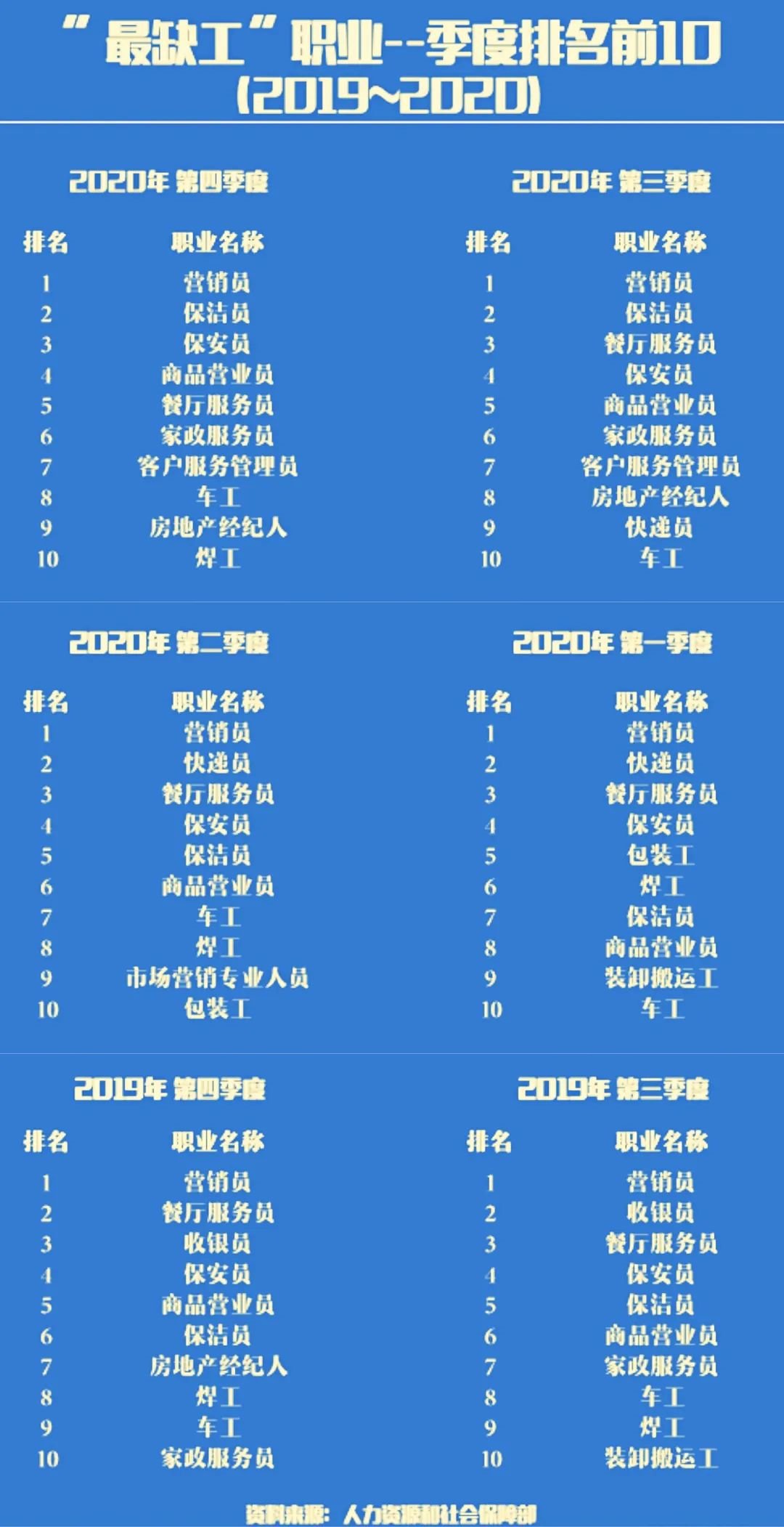 ●餐厅服务员、保安员、保洁员、商品营业员等连续多期名列前十