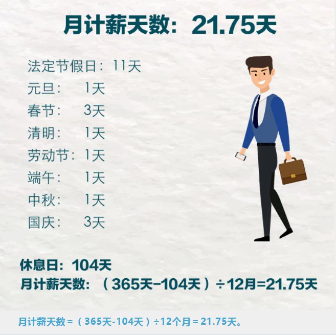 对大多数人来说,月计薪天数是固定的21.75天。