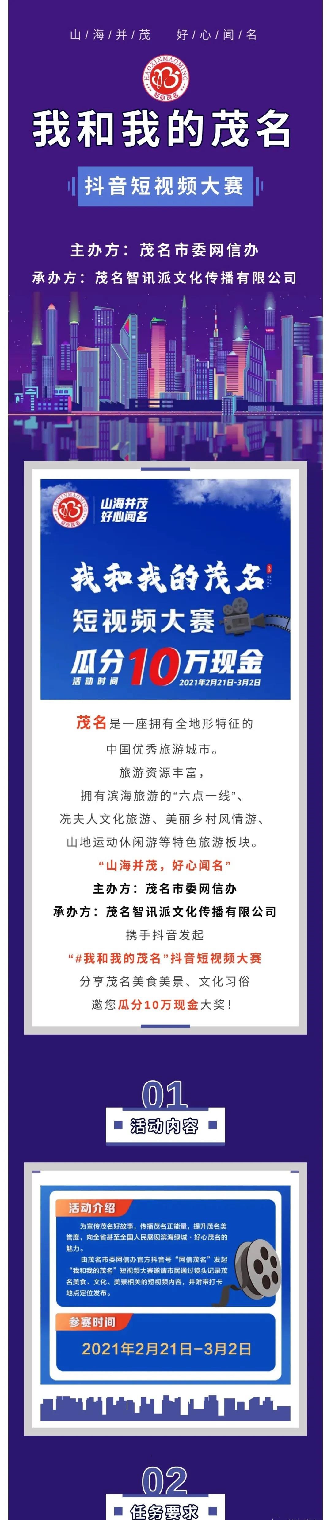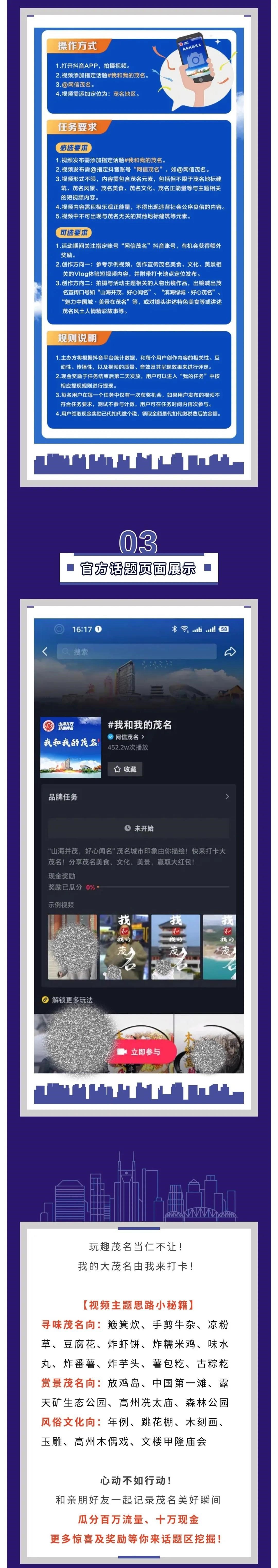 由茂名市委网信办官方抖音号“网信茂名”发起我和我的茂名”短视频大赛邀请市民通过镜头记录茂名美食、文化、美景相关的短视频内容,并附带打卡地点定位发布。