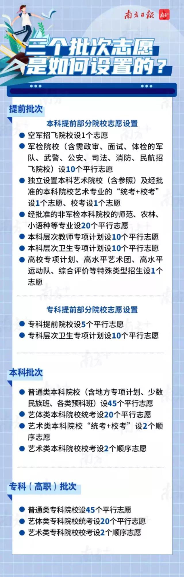 在本科批次,普通类本科院校(含地方专项计划、少数民族班、各类预科班)设45个平行志愿;艺体类本科院校统考设20个平行志愿;艺术类本科院校“统考+校考”设2个顺序志愿;艺术类本科院校校考设2个顺序志愿。