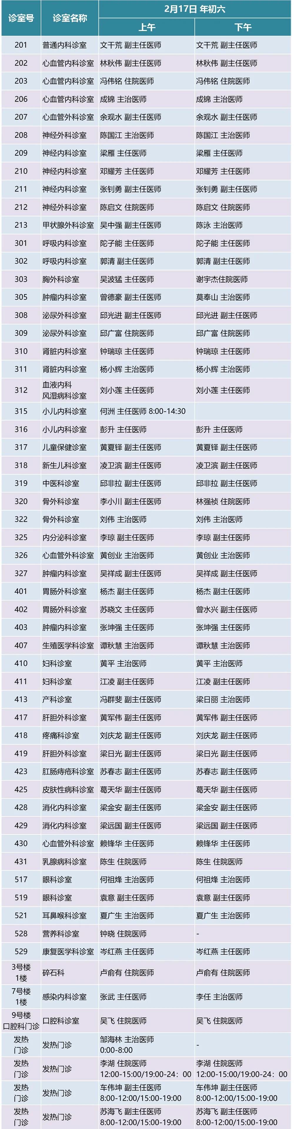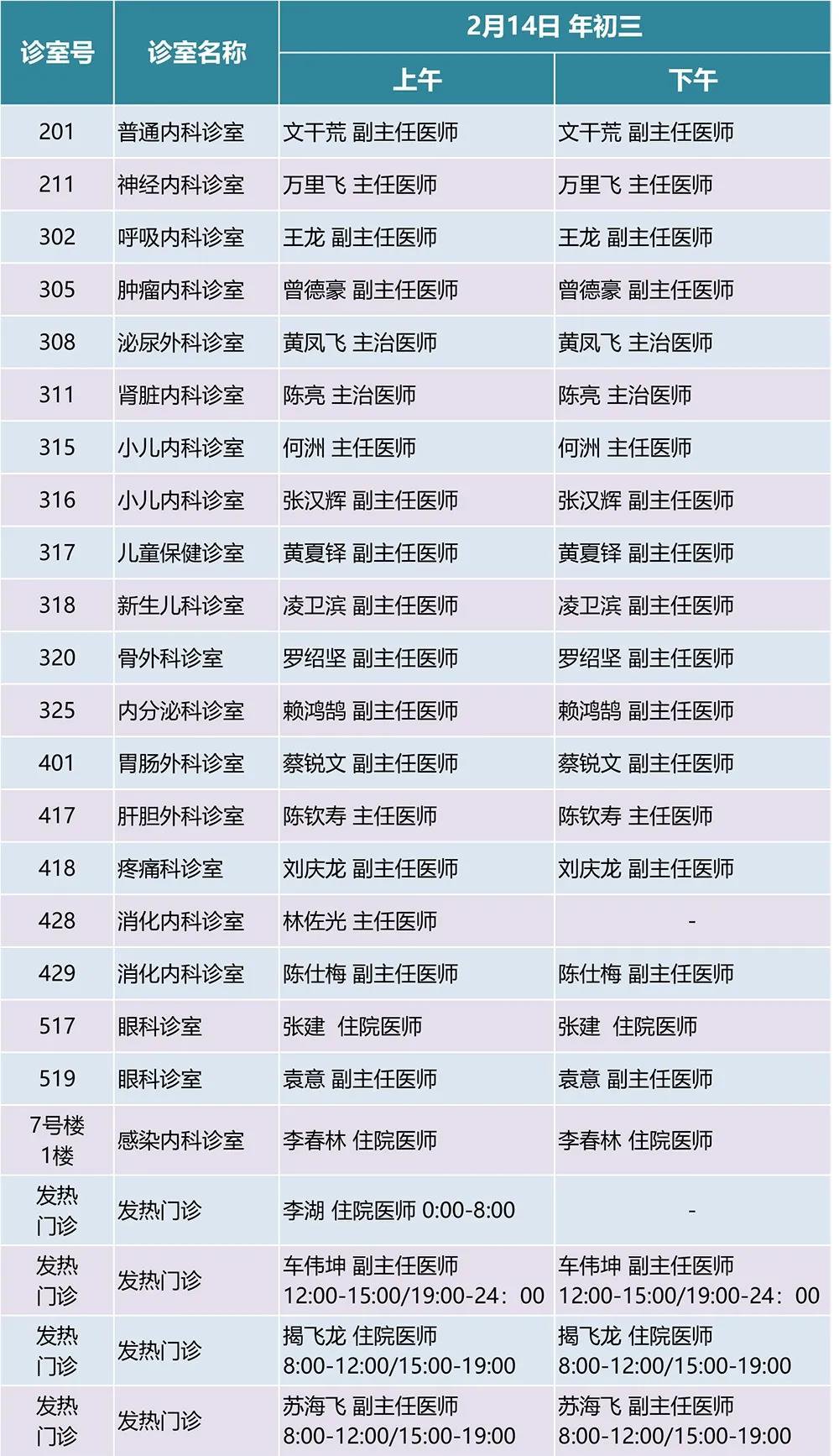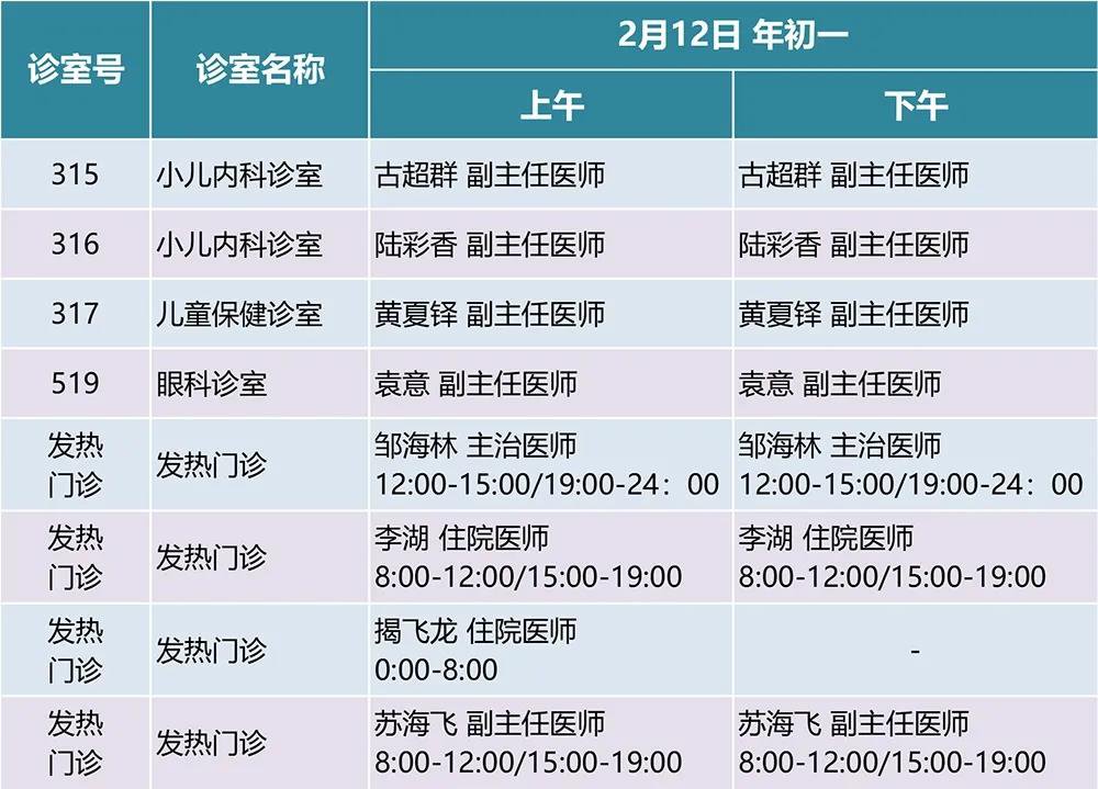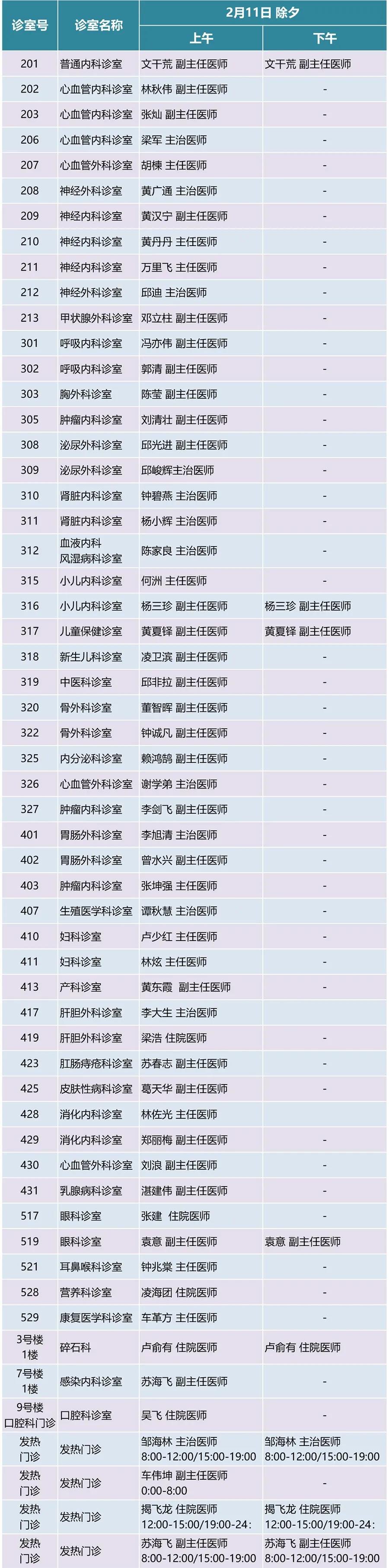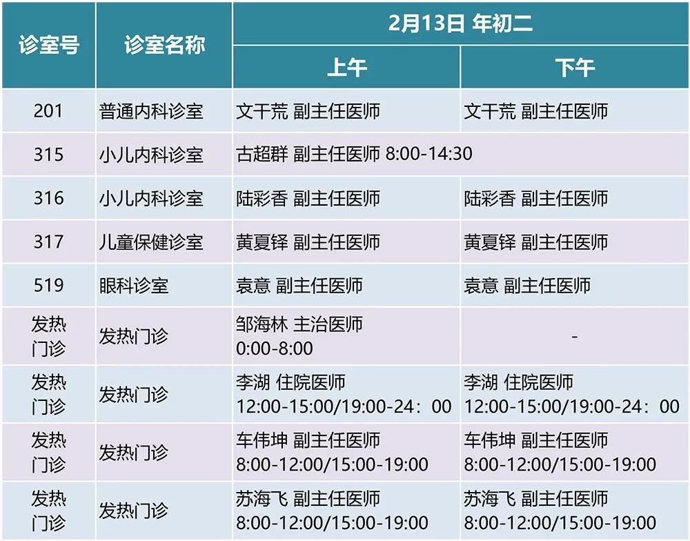 2月11日(除夕)下午、12日(年初一)、13日(年初二)、14日(年初三)部分科室出诊;
