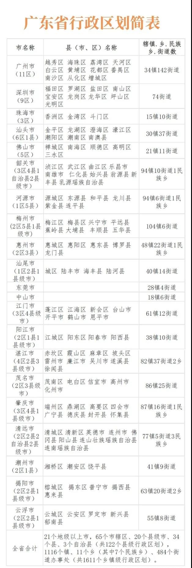 该简表显示,截止到2020年12月底,广东全省共有21个地级以上市,65个市辖区、20个县级市、34个县、3个自治县(共122个县级行政区划),1116个镇、11个乡(其中7个民族乡)、484个街道办事处(共1611个乡镇级行政区划)。
