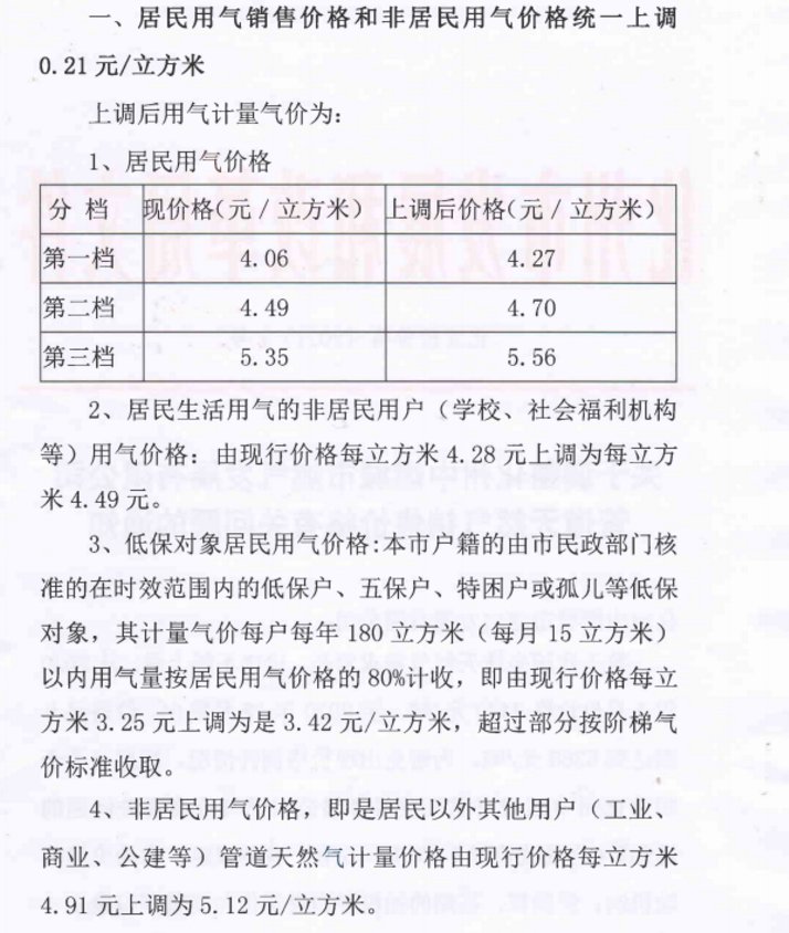 根据化发改价格〔2021〕1号文件,从2021年2月1日零时起,天然气销售价格调整如下:居民用气和非居民用气销售价格统一上调0.21元/方。请化州市民知悉!