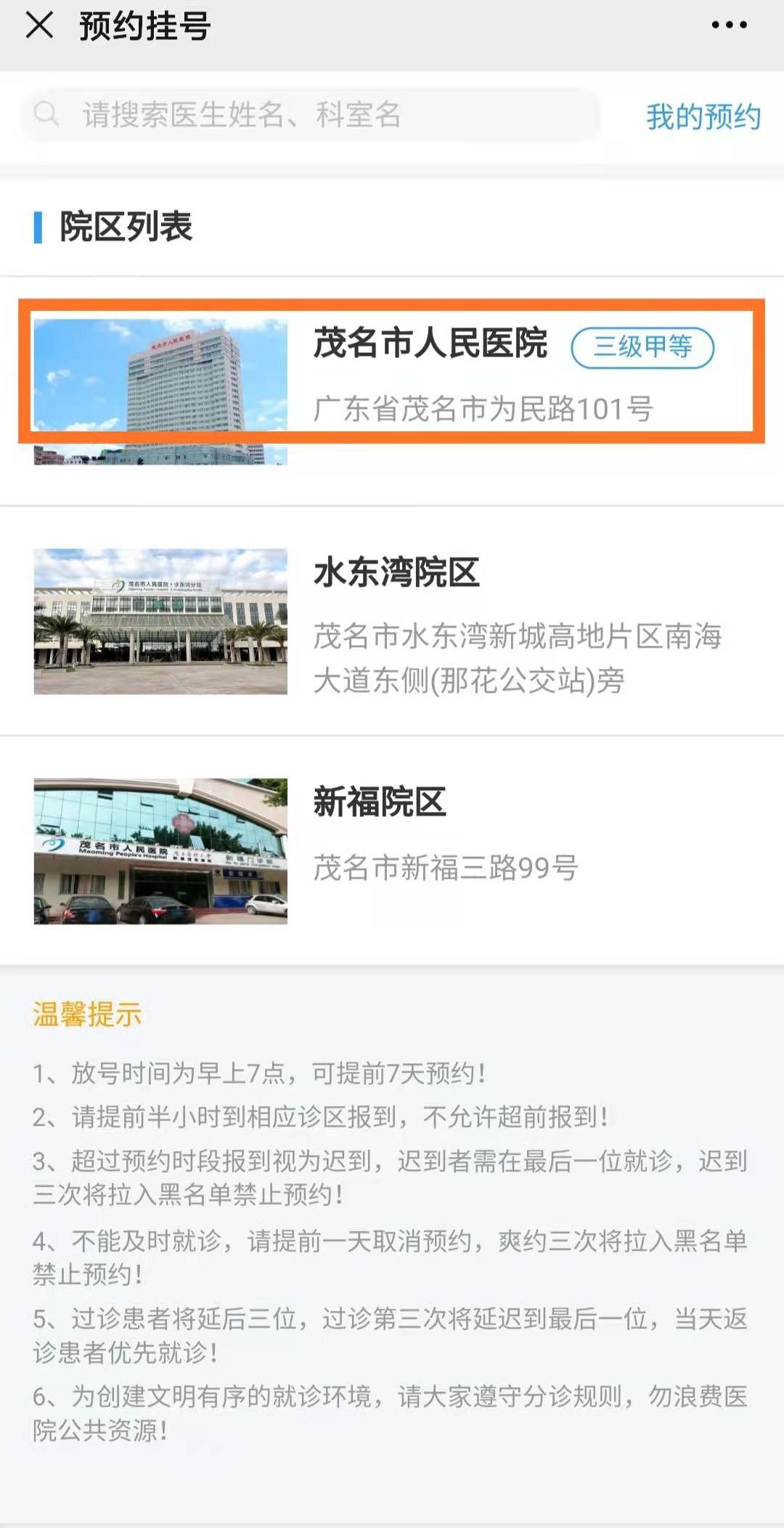 第一步:微信关注【茂名市人民医院】,在菜单栏中【个人中心】绑定个人信息及就诊卡,并在菜单栏的子栏目中,选择【预约挂号】。